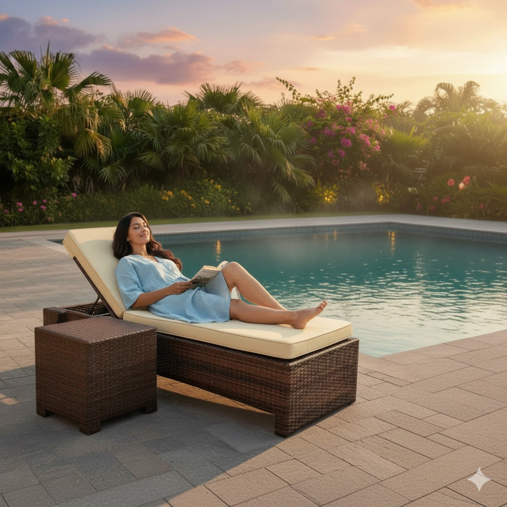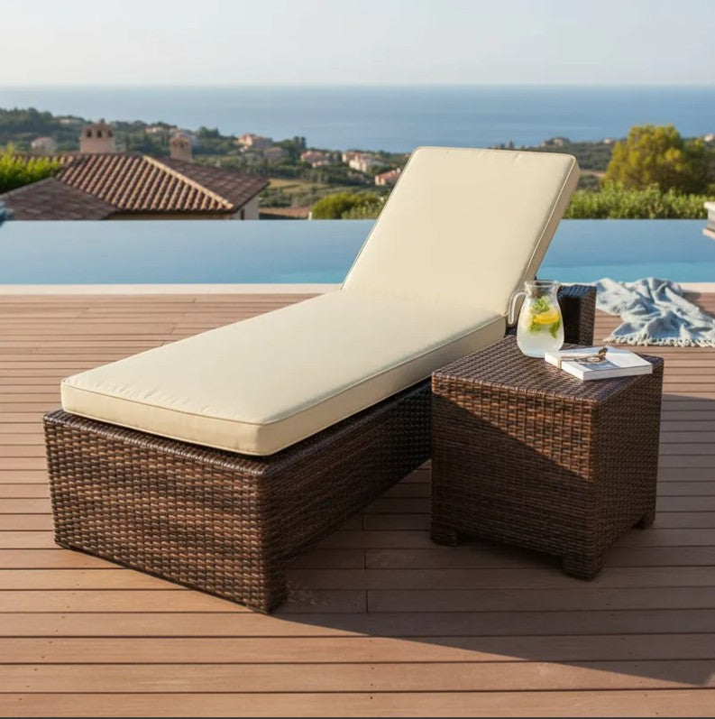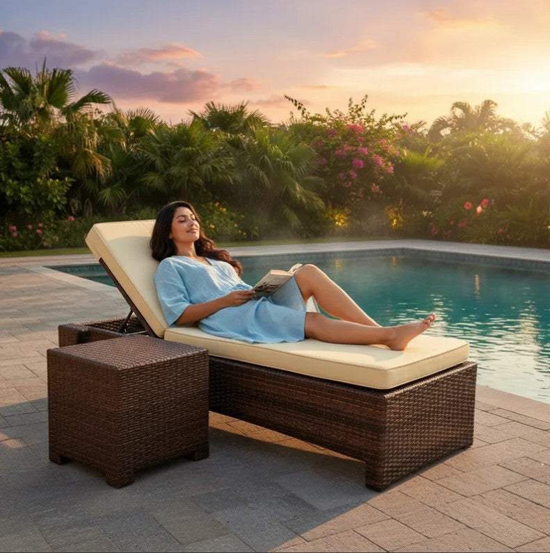 Tejido de Ratán Sintético Premium: El cuerpo del camastro y la mesa auxiliar tienen un tejido meticuloso de Ratán Sintético de PP de alta densidad, que es extremadamente resistente a la intemperie y altamente eficaz contra el deterioro por rayos UV.